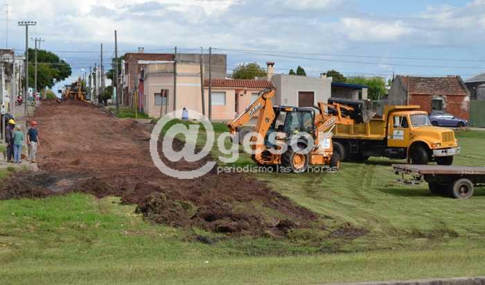 Personal y maquinaria del Departamento de Obras encara la construcción de la calle a nuevo en ese lugar, compactando material granular y colocando caños en la cuneta para facilitar el desagüe de pluviales.