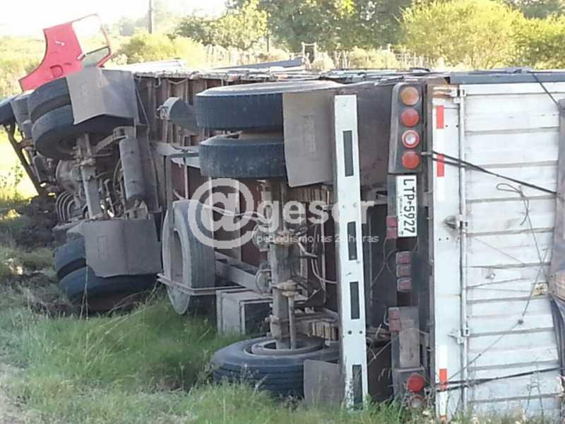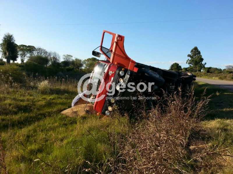 El vehículo conducido por un hombre de iniciales P A L de 51 años, como único ocupante, se desplazaba a la altura del Kim 354 de la Ruta Nº 21 de norte a Sur, volcó quedando de costado y buena parte de su carga esparcida en el lugar.