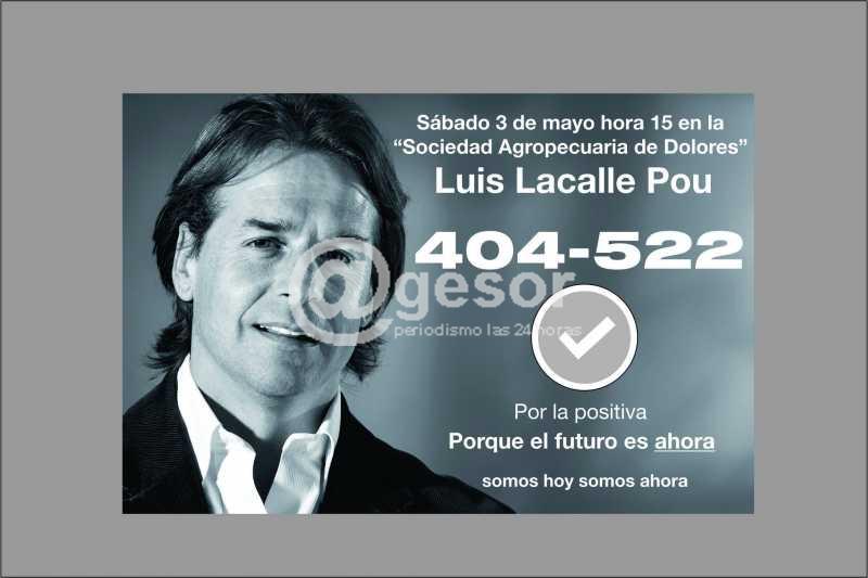Sábado 3 de mayo, hora 15, en la Sociedad Agropecuaria de Dolores", Luis Lacalle Pou. 404-522