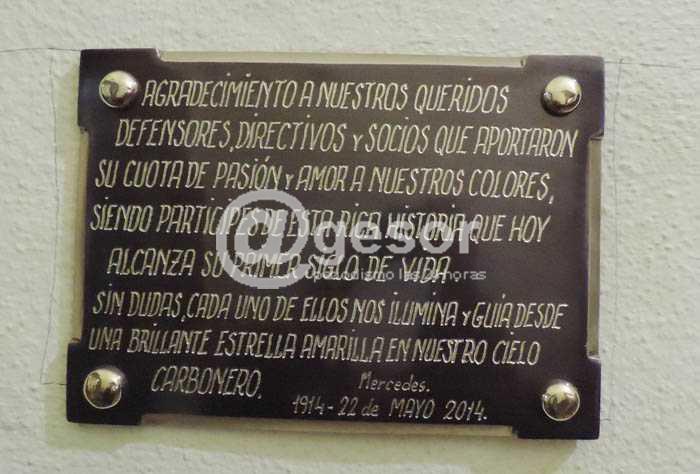 Previo a la sesión que la Liga Departamental de Fútbol de Soriano mantuvo en la noche de este jueves en la sede social delClub Peñarol de Mercedes, en honor a sus 100 años de vida, se realizó una emotiva ceremonia, enmarcada en la celebración del centenario aurinegro. En la oportunidad, con la presencia del actual Presidente peñarolense, Oscar Méndez, y otros dirigentes, hinchas y amigos del club, se descubrió una placa recordatoria para testimoniar el agradecimiento a quienes han fallecido pero que sin dudas  son parte de la rica historia de la institución. Al respecto, hizo uso de la palabra Enrique Mezquida, integrante de la comisión de festejos. La placa, ubicada en la galería de ingreso a la sede, señala: “Agradecimiento a nuestros queridos defensores, directivos y socios que aportaron su cuota de pasión y amor a nuestros colores, siendo partícipes de esta rica historia que hoy alcanza su primer siglo de vida. Sin dudas, cada uno de ellos nos ilumina y guía desde una brillante estrella amarilla en nuestro cielo carbonero. Mercedes – 1914- 22 de mayo – 2014".