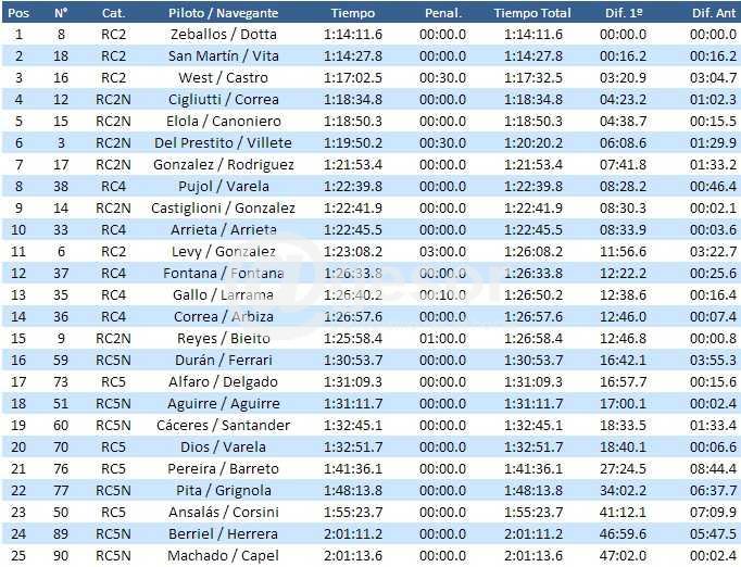 Finalmente la diferencia a favor de Zeballos fue de solo 16.2 segundos con respecto a San Martín, en lo que fue su segunda victoria en el año, tras la obtenida en Piriápolis. Además, Zeballos-Dotta se proclamaron como los vencedores de la clase mayor de nuestro rally en la primera rueda del campeonato.