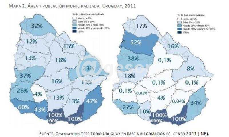 “La población y territorio municipalizado no se distribuye homogéneamente en los departamentos y tipos de localidad. Las personas que residen en localidades de entre 5.000 y 20.000 habitantes son las que tienen más chance de residir en un territorio municipalizado”. El informe recuerda que los departamentos decidieron municipalizar el territorio con distintos criterios: “en un extremo tenemos los casos de Montevideo, Canelones y Maldonado que dividieron el 100% de su territorio en Municipios. En el otro extremo está Flores con un solo Municipio, cubriendo 0,02% del territorio y 4% de la población”. Otros departamentos, como Salto o Paysandú, cubrieron buena parte de su territorio con Municipios “pero incluyeron bajo porcentaje de población. Por último, otros departamentos cubrieron muy poca superficie pero un porcentaje de población importante como son los casos de Soriano, Tacuarembó y Treinta y Tres”.