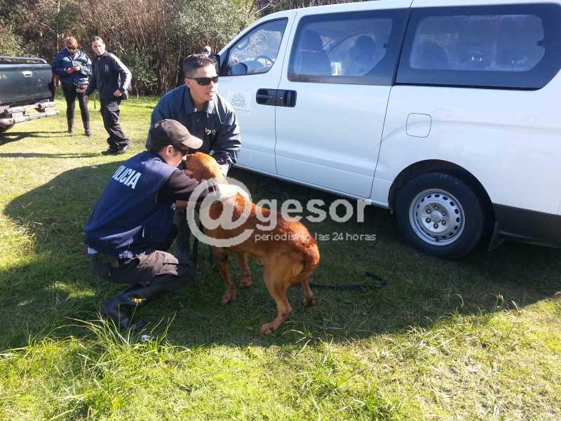 Ya en Los Arrayanes, tras detenerse a dialogar con algunos vecinos se dirigieron hacia el fondo del barrio o paraje, donde los funcionarios se colocaron indumentaria especial y bajaron uno de los dos perros adiestrados al que hicieron olfatear la prenda de Nicolás y salieron a recorrer la franja costera sobre el fondo de Los Arrayanes.
