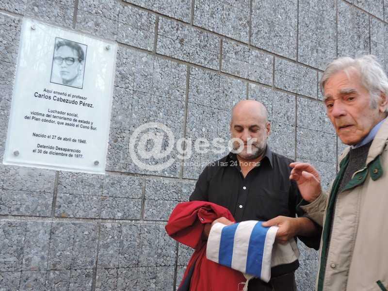 En el patio de acceso al Liceo Nº 1 de Mercedes, donde impartió clases, y en un acto lleno de alumnos de esa casa de estudios el prof. Carlos Cabezudo fue recordado colocándose una placa en su memoria. “Aquí enseñó el Profesor Carlos Cabezudo Pérez. Luchador social, víctima del terrorismo de estado y del Plan Cóndor, que asoló el Cono Sur. Nacido el 27 de abril de 1948. Detenido Desaparecido el 30 de diciembre de 1977”, expresa la placa colocada en el patio de acceso del Liceo “José María Campos”.