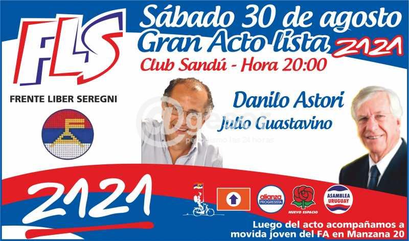 Este sábado 30 de agosto se realizará gran acto de la lista 2121, en el Club Sandú de Mercedes, a partir de las 20:00 horas. Se contará con la presencia del vicepresidente de la República, Cr. Danilo Astori y del candidato a diputado por el Frente Líber Seregni, Dr. Julio Guastavino.