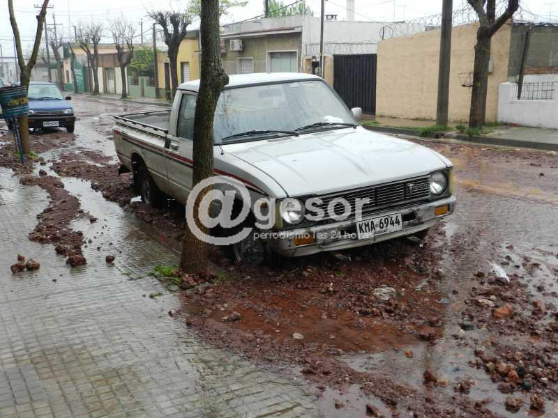 Debido a las intensas lluvias que están ocurriendo en Mercedes desde el sábado, este domingo pudo apreciarse importante erosión causada en las dos cuadras de Varela desde Blanes Viale a Don Bosco que están construyéndose a nuevo por parte de la comuna.