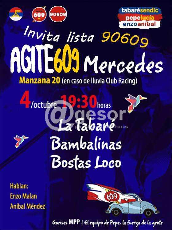 Unite al Agite 609! Este sábado desde las 20.00 horas en Club Racing, gran festival musical de Murga y Rock and Roll! Arte callejero, bandas locales y por primera vez en Mercedes: La Tabaré! Vení, disfrutá, participá! Lista noventa seiscientos nueve! Enzo Diputado! Frente amplio!"