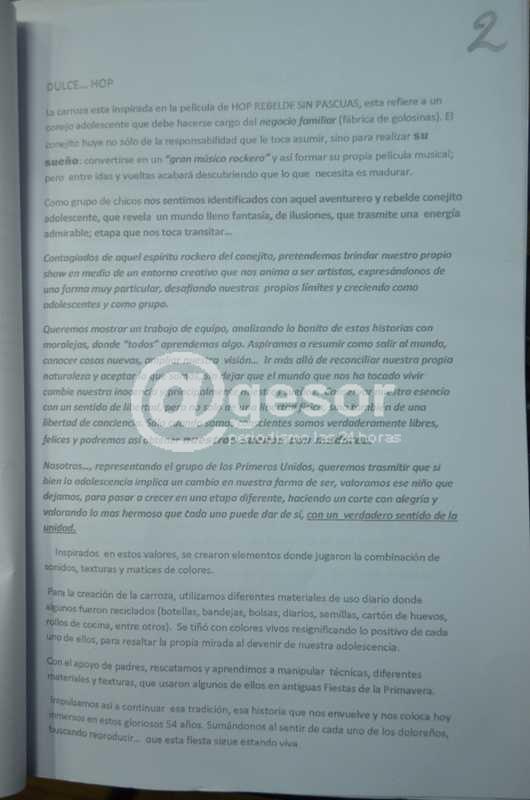 La carroza está inspirada en la película Hop Rebelde sin Pascuas, esta refiere a un conjeo adolescente que debe hacerse cargo del negocio familiar (fábrica de golosinas). El conejito huye no sólo de la responsabilidad que le toca asumir, sino para realizar su sueño: convertirse en "un gran músico rockero" y así formar su propia película musical; pero entre idas y vueltas acabará descubriendo que lo que necesita es madurar.