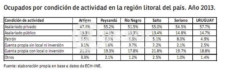 (por Aldo Roque Difilippo) El año pasado el litoral uruguayo presentó un panorama más desfavorable que el resto del país en materia laboral. Tal lo que se desprende del “Informe sobre la realidad económica de la región litoral del país” elaborado por el Instituto Cuesta Duarte del PIT CNT. El documento analiza algunos elementos referidos a la situación económica de la región litoral de nuestro país en el año 2013, con especial énfasis en la descripción de las principales variables del mercado de trabajo. Entendiendo por región litoral al territorio comprendido por los departamentos de Soriano, Río Negro, Paysandú y Salto, más la ciudad de Bella Unión.