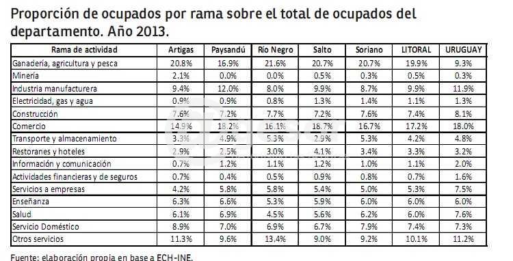 Específicamente la ganadería vacuna emplea un 9,2% del total de ocupados a nivel departamental en Río Negro, mientras que en el resto de los departamentos a nivel regional este guarismo oscila entre el 4% y el 7% del total de ocupados. Por su parte, la fruticultura y horticultura tienen un peso muy importante en Salto, donde conjuntamente estas actividades ocupan al 13,3% del total de ocupados a nivel departamental. El cultivo de cereales tiene una importancia significativa en Río Negro y Soriano, mientras que en Paysandú también corresponde destacar el peso de la actividad de la forestación. Por su parte, en Artigas tiene relevancia el cultivo de la caña de azúcar, el arroz y las actividades vinculadas a la extracción de minerales.