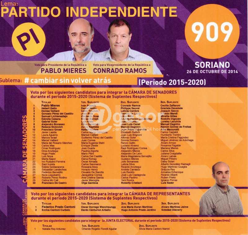 El Partido Independiente en Soriano presenta dos opciones electorales a través de las listas 696 y 909, encabezadas por la fórmula Pablo Mieres - Conrado Ramos y los dos candidatos a diputado son Roberto Baz y Federico Prado. Adjuntas ofrecemas las dos hojas de votación.