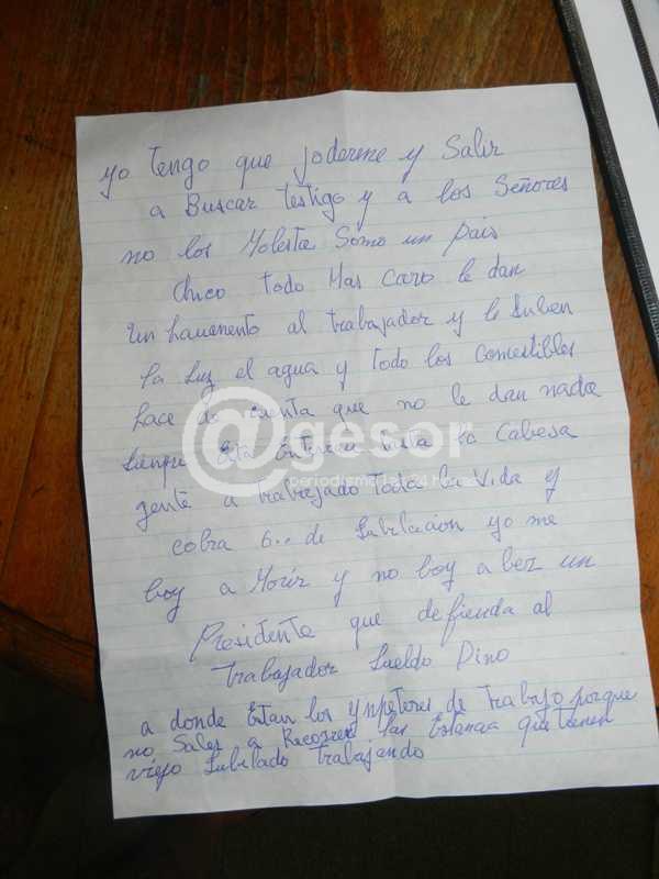 Desde que tengo huso de rason a los politicos no los banco son pura mentiras ninguno a defendido al trabajador sueldo miserables gubilación de 6.000 el trabajador sueldo 15.000 o 20.000 y todavía le ponen impuesto al sueldo no tienen berguensa yo desde que tengo 13 años rompiendome el culo trabaje en 3 estancia. En la Mazorca de Arcaus en Cisne del Alverto Perera en la Union de Acebedo y Urdangarin y boy a la Caja de Jubilación no fuguro en ninguna que le parese yo tengo que joderme y salir a buscar testigo y a los señores no los molesta somo un pais chico todo mas caro le dan haumento al trabajador y le suben la luz el agua y todo los comestibles hace de cuenta que no le dan nada siempre esta enterrau hasta la cabeza gente a trabajado toda la vida y cobra 600 de jubilacion yo me boy a morir y no boy a ber un Presidente que defienda al trabajador sueldo dino