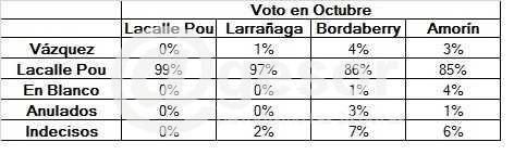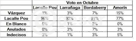 Los votantes de Lacalle Pou mayoritariamente repetirán su voto en diciembre próximo (96%), 1% dijo que votará por Vázquez-Sendic, y 3% de declaró indeciso.