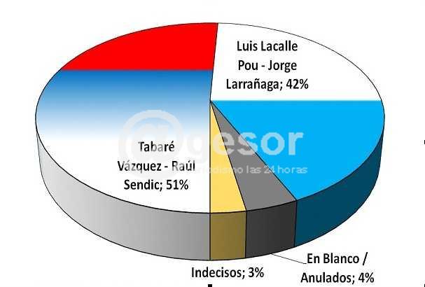 Que en la última encuesta pasa a ser el siguiente: Vázquez 51%, Lacalle 421%, en blanco 1%, anulados 3%, indecisos 3%. (ver foto 4)