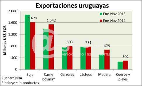 Las ventas de carne bovina, madera y productos derivados y arroz crecieron respecto a los primeros once meses de 2013. Esto se explica por los mayores volúmenes colocados así como también al precio promedio de exportación superior (para la carne bovina y el arroz). Por su parte, las ventas de madera y productos de madera tuvieron un importante crecimiento en volumen de 35,8% en la comparación interanual que compensó la caída de 4,6% en el precio de exportación. Esto se debió al comienzo de la actividad de la segunda planta de producción de pasta de celulosa en el país.