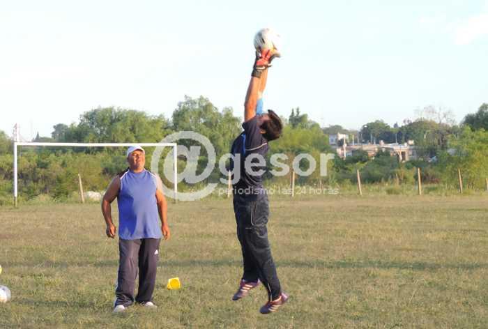 Foto: Diego Vera, portero de Sud América, exigido por el entrenador de goleros de la selección mayor de Soriano Capital, Uberfil Aguiar, en una de las dos pocas prácticas que ha podido realizar el combinado mercedario.