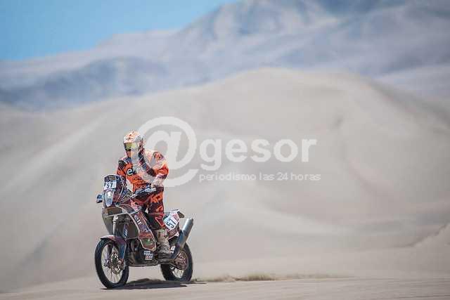 Ha tenido muchas experiencias pero nunca lo que le sucedió hoy donde tuvo el susto de su vida “Cuando comenzaba en una bajada de una de las tantas dunas tengo una caída boba, me levanto rápidamente y pongo la alarma que avisa a otro competidor que hay una moto caída y que tengan cuidado. En el momento que la coloco siento un ruido que viene de arriba y sale un camión Kamaz que se me viene encima. Le vi la cara del piloto que se sorprendía, pero al ser bajada y arena el camión seguía bajando. Yo que veía venir esa mole cada vez más cerca de mí, pero por suerte paró a menos de un metro. Prendí la moto y me fui. El corazón me quedó palpitando como media hora. Fue el susto de mi vida”.