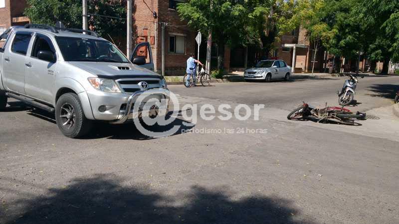 El hecho ocurrió minutos antes de las 11:00 horas de este martes, en la intersección de Avenida Fregeiro y Oribe de la ciudad de Mercedes. Fueron protagonistas la camioneta Toyota Hilux, conducida por Fabián Rodriguez, que se desplazaba por Oribe con dirección al norte, y la moto Yumbo, matrícula KMM 584, guiada por Natalia Gallero, que circulaba por Fregeiro al oeste. La mujer fue quien resultó con algunas lesiones, por lo que debió ser trasladada en una ambulancia a centro asistencial local. En el hecho intervino personal policial y de la Brigada de Tránsito de la Intendencia de Soriano.