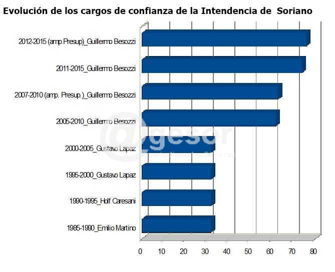 Durante 20 años la Intendencia de Soriano tuvo 32 cargos de confianza (adminstraciones Martino, Caresani y Lapaz). Al asumir Besozzi en 2005 duplicó los cargos de confianza llevándolos a 62. Cinco años más tarde sumó otro cargo de confianza. Al asumir por segundo período consecutivo como Intendente siguió incorporando cargos de confianza, llevándolos a 74, y un año después, en el 2012 incorporó dos más, quedando en 76.