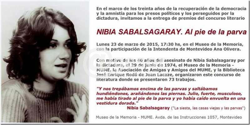 En el marco de los treinta años de la recuperación de la democracia y la amnistía para los presos políticos y los perseguidos por la dictadura, se organizó por parte de la Asociación de Amigas y Amigos del Museo de la Memoria, concurso literario denominado "Nibia Sabalsagaray, al pie de la parva".