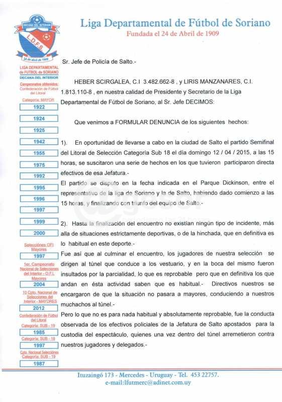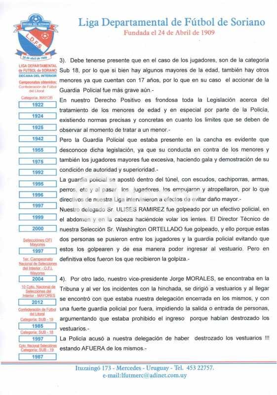 En la sesión semanal de la Liga Departamental de Fútbol de Soriano, se dio a conocer el texto de la denuncia que ésta enviará a la Jefatura de Policía de Salto denunciando abuso de autoridad por parte de funcionarios de esa dependencia del Ministerio del Interior en perjuicio de la delegación de Soriano Capital (Mercedes) que disputara semifinal de la Copa de Selecciones Sub 18 de la OFI ante el equipo local en el estadio "Ernesto Dickinson".