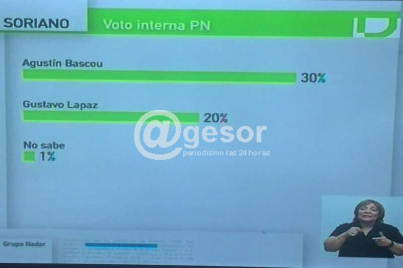 En la interna nacionalista, Grupo Radar establece que Agustín Bascou registra el 30% de intención de voto, Gustavo Lapaz 20% y no sabe 1%.
