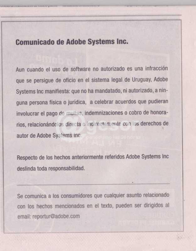 “Aun cuando el uso de software no autorizado es una infracción que se persigue de oficio en el sistema legal de Uruguay, Adobe Systems Inc manifiesta: que no ha mandatado, ni autorizado, a ninguna persona física o jurídica, a celebrar acuerdos que pudieran involucrar el pago de multas, indemnizaciones o cobro de honorarios, relacionándolos directa o indirectamente con los derechos de autor de Adobe Systems Inc.