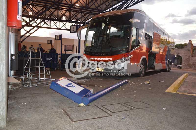 De un momento a otro el coche subió el cordón de la plataforma 4, derribando el pilar que se encontraba en ese andén, como así también la columna que indica el número del mismo. Por este motivo, el ómnibus terminó impactando contra la parte trasera de la agencia, que es donde se depositan las encomiendas, haciendo ceder el fuerte impacto, toda la estructura superior e inferior del local de CUT.