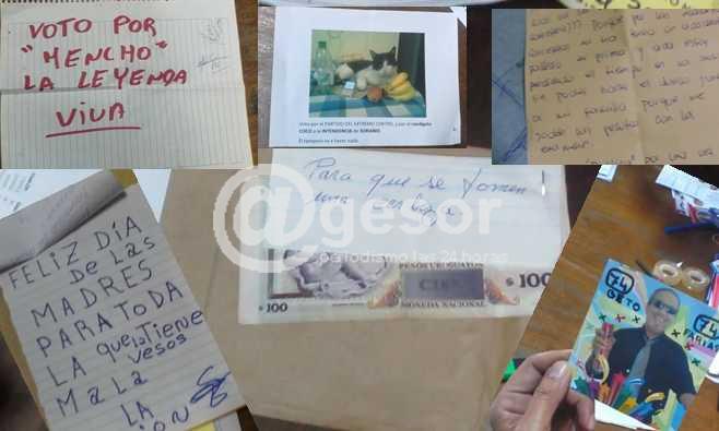 Pero además en el escrutinio que se viene realizando en Mercedes comenzaron a aparecer otros votos que habían sido anulados por los integrantes de las mesas, ya que se tratan de “elementos extraños” como lo califica la Corte Electoral. “Voto por “Mencho” la leyenda viva”, un saludo por el día de las Madres, “voto por el PARTIDO DEL EXTREMO CENTRO, por el candigato COCO a la INTENDENCIA de SORIANO. Él tampoco va a hacer nada”; votos a Beto Farías; y hasta un billete de $ 100 “Para que se tomen una cerveza”