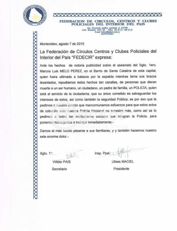 La Federación de Círculos, Centros y Clubes Policiales del Interior del país "FEDECIR" emitió comunicación que hizo llegar a @gesor en el que expresa: "Ante los hechos de notoria publicidad sobre el asesinato del Sgto. 1° Marcos Luis Melo Pérez, en el barrio Santa Catalina de la capital del país, quien fuera ultimado a balazos por la espalda mientras tenía sus brazos levantados, repudiamos estos hechos tan canallas, de personas que dieran muerte a un ser humano, un ciudadano, un padre de familia, un policía, quien está al servicio de la ciudadanía, que su único cometido es salvaguardar los intereses de éstos, así como también la seguridad pública, es por eso que le pedimos a nuestro Estado que macomunemos esfuerzos para que estos actos de cobardía ante nuestra Policía Nacional no sucedan más, como así se lo pedimos a todas las instituciones sociales que integran la Policía, para ponernos todos juntos a trabajar inmediatamente.
