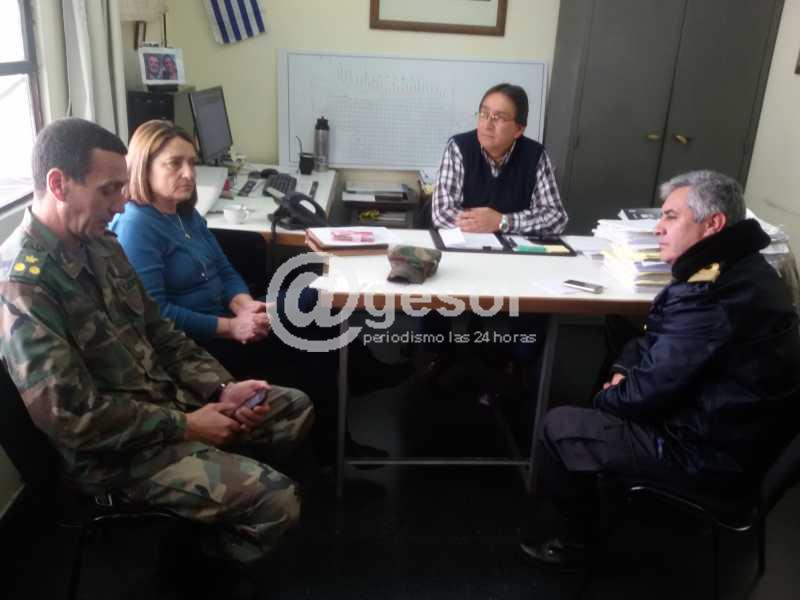 (*) En la reunión del CDE que preside el Intendente Bascou, se encontraban presentes el coordinador del Comité, Andrés Magnone, la Directora de Acción Social, María Fajardo, el Prefecto Rodrigo Barcelona y el Jefe del Batallón Asencio, Tte. Cnel. Jorge Laquintanta.
