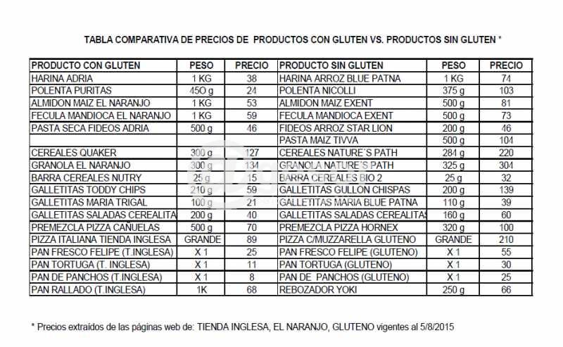 A modo de ejemplo; la harina Adria de un kilo tiene un valor de $38, mientras que la harina de arroz Blue Patna de un kilo (apta para celíacos), cuesta $74, casi el doble. La polenta Puritas de 450 gramos cuesta $24, mientras que la polenta Nicolli de 375 gramos y habilitada para el consumo de celíacos cuesta $103. La lista comparativa de precios fue realizada el 5 de agosto de este año y extraída de las páginas web de Tienda Inglesa, El Naranjo y Gluteno.