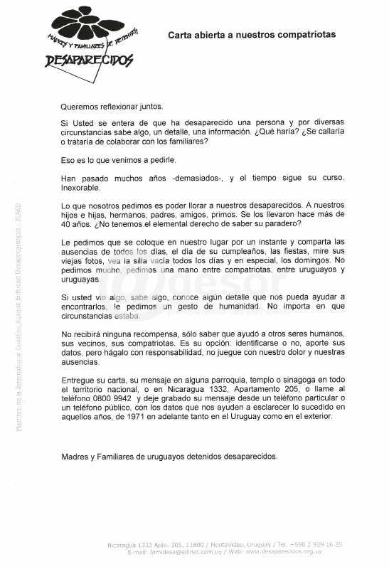Familiares de Detenidos Desaparecidos realizaron un llamado humanitario. Mediante una carta dirigida “a nuestros compatriotas” Madres y Familiares de Uruguayos Detenidos Desaparecidos pide “una mano entre compatriotas, entre uruguayos y uruguayas” para aportar detalles en la busqueda de los desaparecidos.