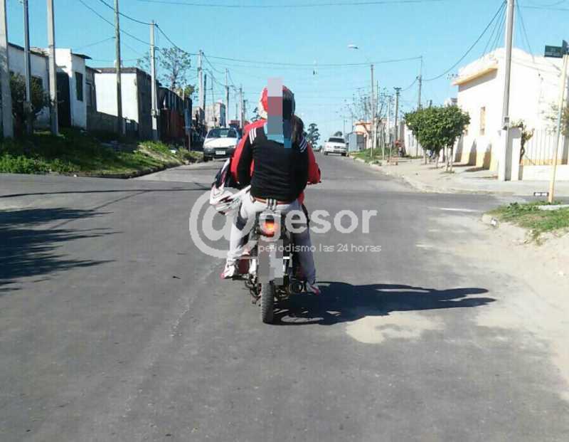(*) En la foto se ve claramente como una acompañante lleva colgado el casco en uno de sus brazos, situación que se dio en calle 33 entre Varela y Oribe.