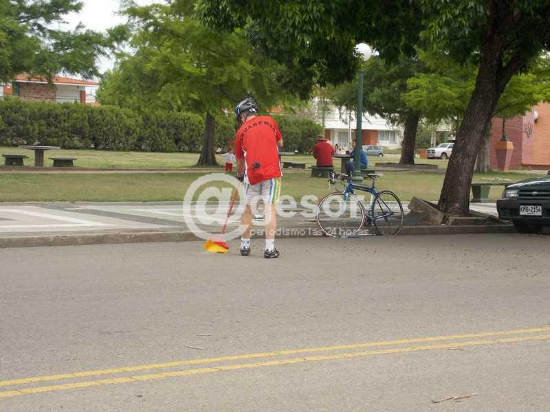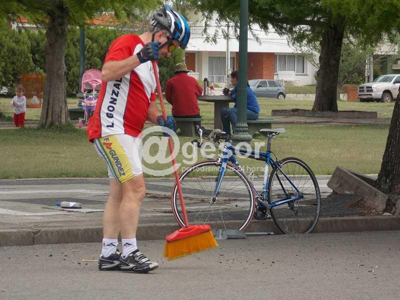 Un hecho no habitual se dio en la rambla mercedaria cuando uno de los ciclistas que generalmente salen a entrenar en bicicleta, esta vez debió bajar de la chiva para barrer el pavimento ya que se encontró con importante cantidad de piedritas y a los efectos de evitar pinchazo, solició una escoba y barrió la calle.