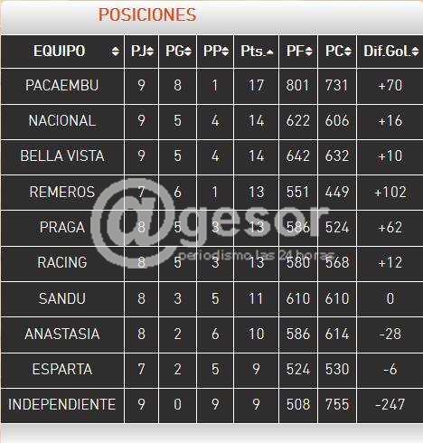Pacaembú terminó su participación en la primera rueda del Campeonato “Competencia” de la Liga Regional de Básquetbol de Soriano totalizando 17 puntos. Al comenzar este lunes, la Novena y última Fecha del certamen, el conjunto que dirige el fraybentino Jorge Cremella venció a Independiente, como visitante, 83-52, como ha sido publicado por @gesor. A lo largo de esta primera ronda, el único equipo que pudo vencer a Pacaembú fue Remeros, en el marco de la Cuarta Fecha. A los costeros les restan dos partidos para concluir su participación en este primer tramo del certamen: con Racing y con Esparta.