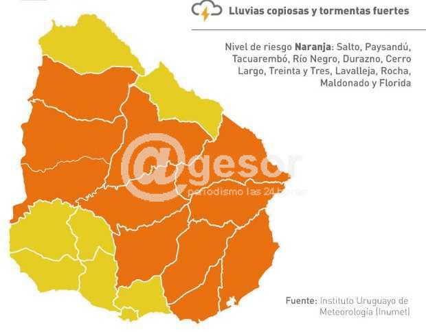 El Instituto Uruguayo de Meteorología emitió una advertencia meteorológica de color naranja para once departamentos, ellos son Salto, Paysandú, Tacuarembó, Río Negro, Durazno, Cerro Largo, Treinta y Tres, Lavalleja, Rocha, Maldonado y Florida. La misma tiene vigencia entre las 15:00 del martes y las 6:00 del miércoles, por la posible ocurrencia de lluvias copiosas y tormentas fuertes, así lo hizo saber el CECOED Soriano .