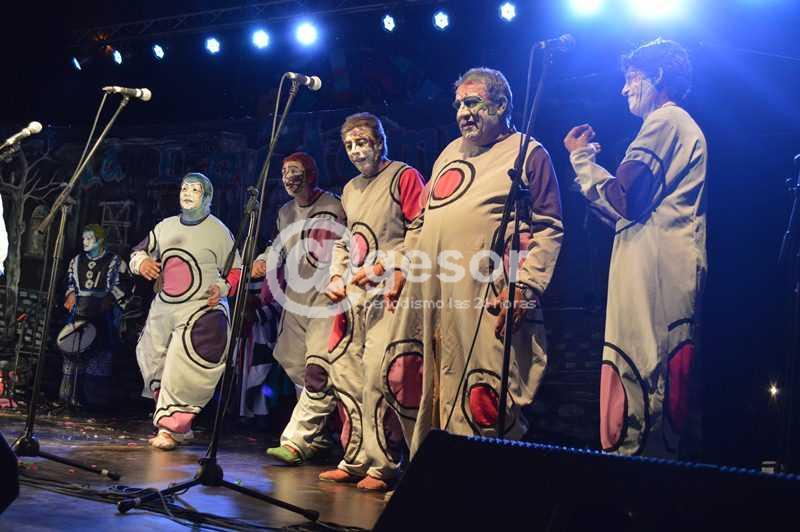 En su nueva presentación la murga subió al escenario de Manzana 20 , con una presentación llena de fuerza precedida de la puesta en escena de Joaquín Montero, que se luce con su potente voz como solista del conjunto de carnaval.