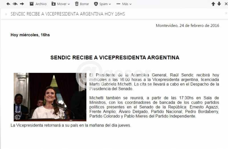 El Presidente de la Asamblea General, Raúl Sendic recibirá hoy miércoles a las 16:00 horas a la Vicepresidenta argentina, licenciada Marta Gabriela Michetti. La cita se llevará a cabo en el Despacho de la Presidencia del Senado.
