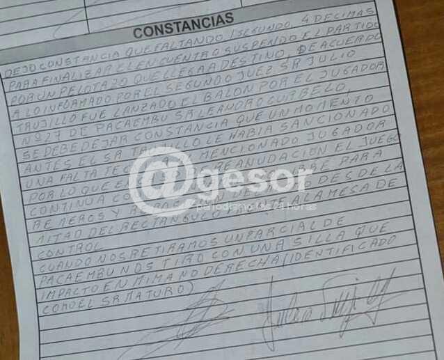 Los jueces denuncian también a un hincha de Pacaembú (ya identificado) que lanzó una silla contra los árbitros, cuando éstos subían por la escalera que conduce al segundo piso del Club Praga, a fin de redactar el formulario correspondiente.