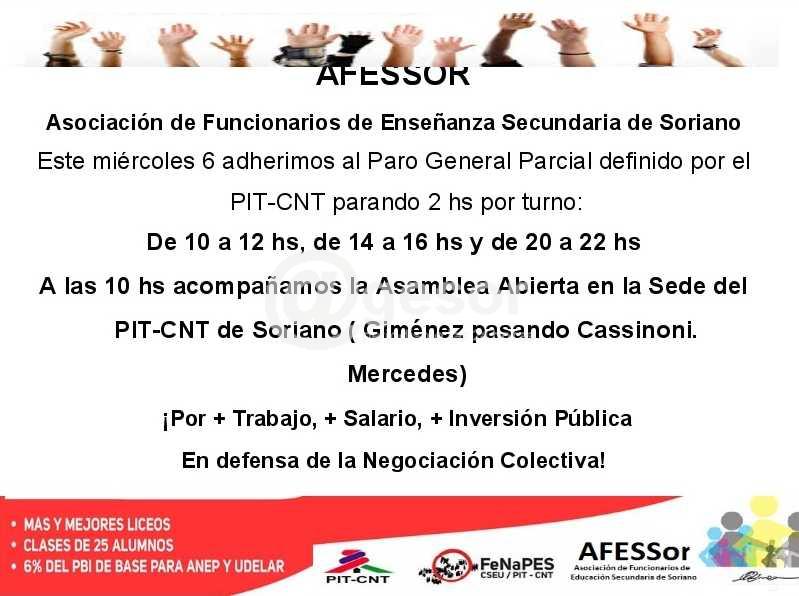 Este miércoles 6 adherimos al Paro General Parcial definido por el PIT CNT parando 2 horas por turno: De 10.00 a 12.00, de 14.00 a 16.00 y de 20.00 a 22.00 horas.