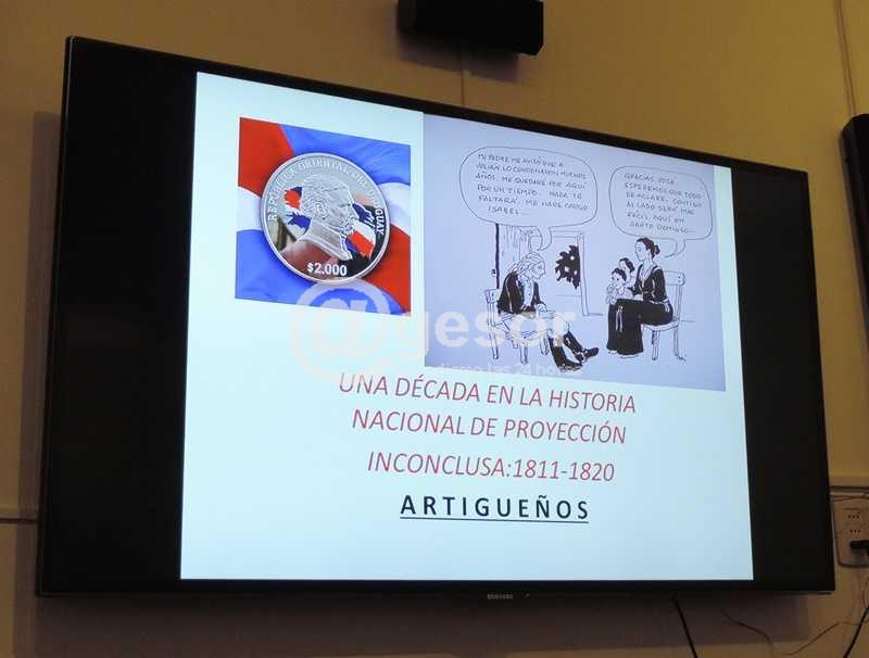 Consultado por @gesor, el Profesor Sáez explicó cual fue el motivo que le impulsó a ofrecer esta exposición junto a su colega: “En primer lugar, en mi condición de mercedario vi la necesidad de retornar en recompensa de algún saber que hemos adquirido a través del tiempo cuestiones que yo le debo, indudablemente, a mi ciudad. Y ahora acompañado por quien siente lo mismo, en este caso el Profesor Ferrer, mercedario también, artista plástico que está exponiendo en distintos centros del país; un hombre con mucha calidad pictórica. Y lo hacemos con un núcleo conductor que es cuestiones que son, quizás, deliberativas, respecto a un Artigas que tuvo solamente nueve años de actuación. Antes de esos nueve años: ¿Quien fue Artigas? ¿Y a posteriori de esos nueve años, entre 1811 y 1820, que es el lapso histórico que conocemos, qué pasó? Tenemos que respondernos esas preguntas. Y también tenemos que respondernos cuestiones de ese lapso. Hay algunas que son sumamente controvertidas. Y como la historia no es algo estático, sino que va cambiando en función de los tiempos y de las situaciones nuevas para traer del pasado cuestiones del presente, esto adquiere la necesidad apremiante de saber: ¿Por qué? ¿Cuándo?, ¿Cómo hubiese sido de esta manera?, ¿Cómo hubiese sido de la otra?. Es decir, dejando la historia de lado, en alguna medida, para meternos en la filosofía de la historia. El núcleo motivador son dibujos, tipo cómics, pero con expresiones en sus leyendas que tienen el sustento del testimonio histórico, porque fueron dichas por sus actores. Y nosotros hemos creído que es una didáctica interesante para establecer entre quienes somos los ponentes y el público una acción dialógica”.