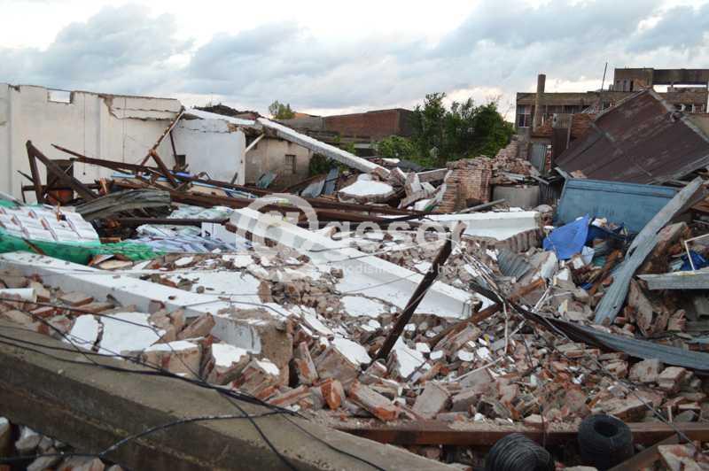 Hay daños en muchas viviendas, comercios, galpones, principalmente voladuras de techos, derrumbes de paredes, caída de antenas, árboles, columnas, cables de tendido eléctrico, entre otros elementos afectados.