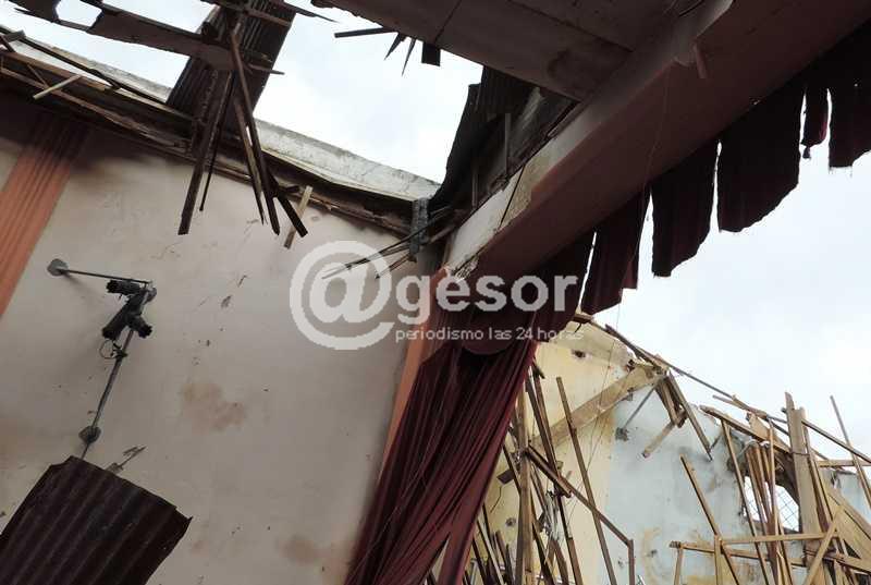 “Se desprendió el techo y el escenario, como ustedes pueden ver, quedó hecho trizas. Lo perdimos todo, prácticamente. En esta sala estaba uno de los cuatro o cinco pianos de cola que van quedando en el Uruguay; y que ahora está hecho papilla. A través de los Fondos concursables del MEC (Ministerio de Educación y Cultura) habíamos obtenido focos para dotar a la sala de una mejor iluminación. La barra que los sostenía está retorcida y los focos vaya a saber dónde terminaron. Habíamos mejorado también el sonido. Teníamos seis bafles de primera generación, que hoy están debajo de los escombros. Había micrófonos y una consola, que fue lo único que se salvó. Como yo vivo a un lado, la llevamos para casa. Para protegerla de la lluvia. Cada vez que llueve o hay un poco de viento, se van cayendo más chapas o palos de lo poco que quedó del techo”.
