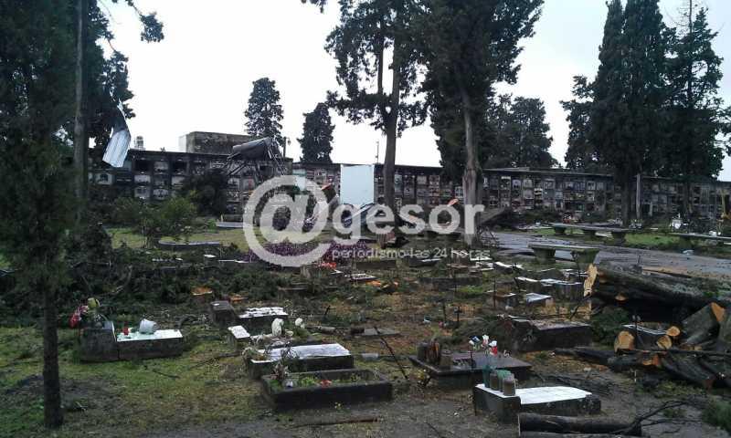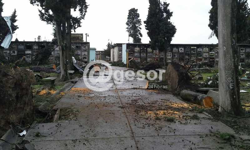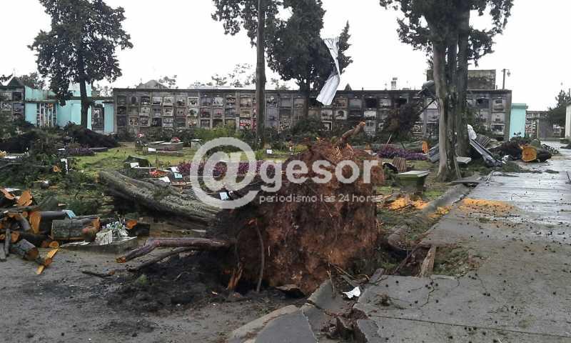 (Dolores). Personal de la Intendencia de Soriano viene trabajando en la limpieza del cementerio doloreño, que también resultara afectado por el tornado del viernes 15 de abril. Caída de varios árboles y voladura de chapas fueron los principales daños de la necrópolis tras el fenómeno meteorológico que azotara a esta ciudad.