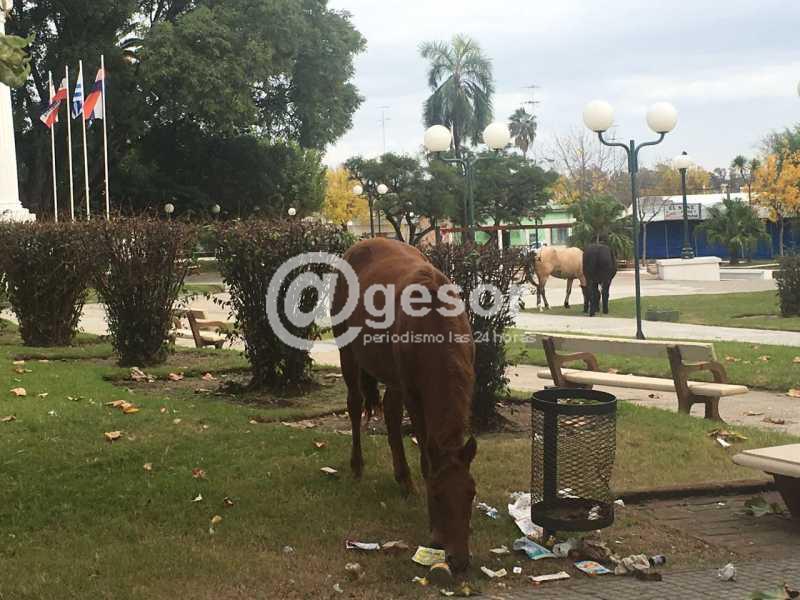De todas maneras hay competencias para el control del uso y cuidado de los espacios públicso, comunes a todos, pero que hoy se ven invadidos por animales de gran porte como los caballos, sumado a la creciente del río Negro que hace que buena parte del parque Guernica esté tapado por el agua y no tengan donde pastar. Ello aunque en plaza Rivera, que es la situación que hoy nos ocupa, estas postales son recurrentes y la primera responsabilidad es de los dueños de estos animales y a partir de la intervención de las autoridades competentes, si ello ocurre, comienzan a darse una serie de situaciones que generan discusiones porque las multas son elevadas, que se trata de animales que usan los pobres para trabajar y que en algún lado tienen que comer, etc, etc. Por lo tanto lo primordial es que los dueños de estos animales busquen mantenerlos en lugares adecuados, los alimenten y cuiden responsablemente, de lo contrario que se actúe en consecuencia.