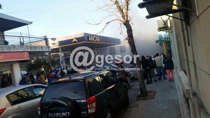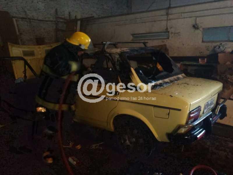Dotación del Destacamento de Bomberos de Mercedes trabaja en ex local donde funcionara la estación de servicio Texaco en el Centro de Mercedes (ubicado en calle Rodó entre Colón y Artigas), que se transformara en garage y que al frente tiene locales comerciales, en virtud de haber tomado fuego un vehículo allí estacionado.