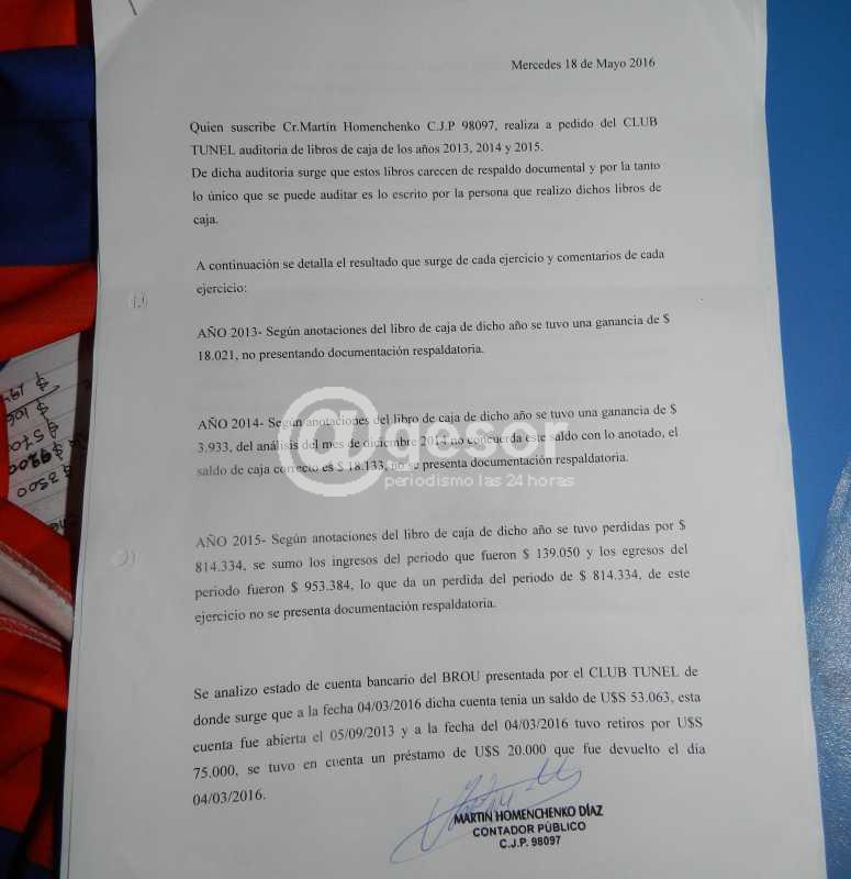 La nueva directiva del Club Túnel de Mercedes presidida por Carlos Maneiro, entregó las hojas y cuadernos recibidos por la dirigencia anterior al Cr. Martín Homenchenko, con la finalidad de realizar una auditoría a los efectos de poder establecer el estado de situación de la institución y de ella surgen miles de dólares retirados de la cuenta bancaria que no fueron ingresados a la contabilidad del club y a su vez durante el año 2015 el déficit supera los $ 800.000. A continuación ofrecemos el texto de la auditoría realizada por el mencionado profesional y que fuera leía ante la asamblea de socios, realizada en la noche del miércoles en la sede del club.