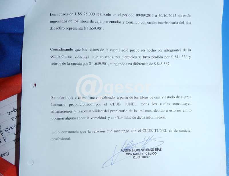 "Quien suscribe Cr. Martín Homenchenko, realiza a pedido del Club Túnel auditoría de libros de caja de los años 2013, 2014 y 2015.