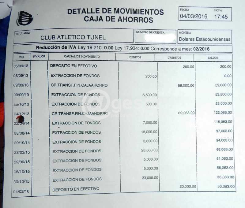 Se analizó estado de cuenta bancario del BROU presentada por el Club Túnel de donde surge que a la fecha 4/3/2016 dicha cuenta tenía un saldo de US$ 53.063, esta cuenta fue abierta el 5/9/2013 y a la fecha del 4/3/2016 tuvo retiros por US$ 75.000, se tuvo en cuenta un préstamo de US$ 20.000 que fue devuelto el día 4/3/2016.